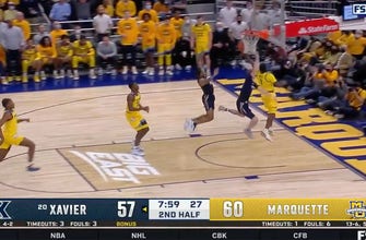 Off the turnover, Marquette’s Kam Jones with the acrobatic up and under lay-up to give the Golden Eagles the 62-57 lead over Xavier.